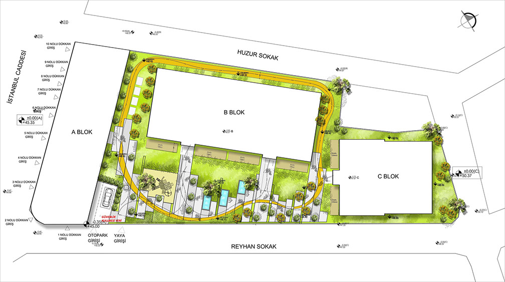 Located in one the most prestigious locations of Istanbul, Bakırcı Kemer Residences landscape design appear very natural in all the propriety, hosting a rich ecosystems of indigenous flora however, exception is taken at the entry garden, where the meadow gives way to a rectangular mowed green, set squarely against the main entrance and natural surrounding landscape. Designed together with Land Design Factory.