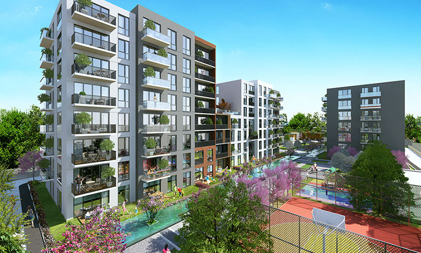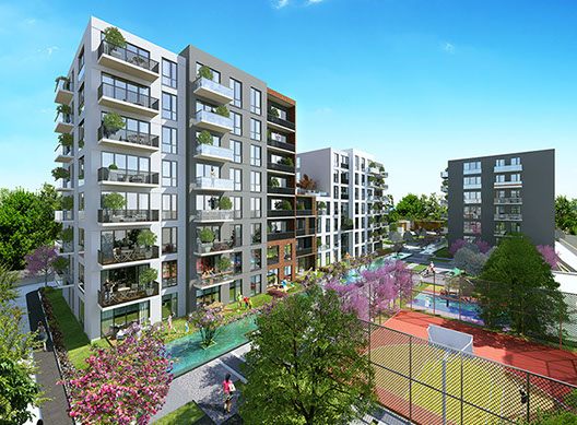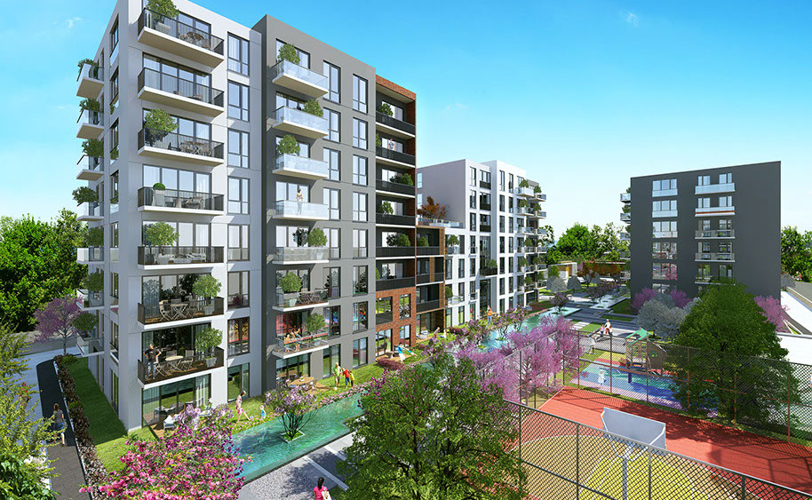 Landscape Design provides low maintenance & water efficient, minimal but attractive garden ambiance in Sancaktepe Istanbul. Various hardscape materials used to create a pattern in paving for residents to enjoy both green
