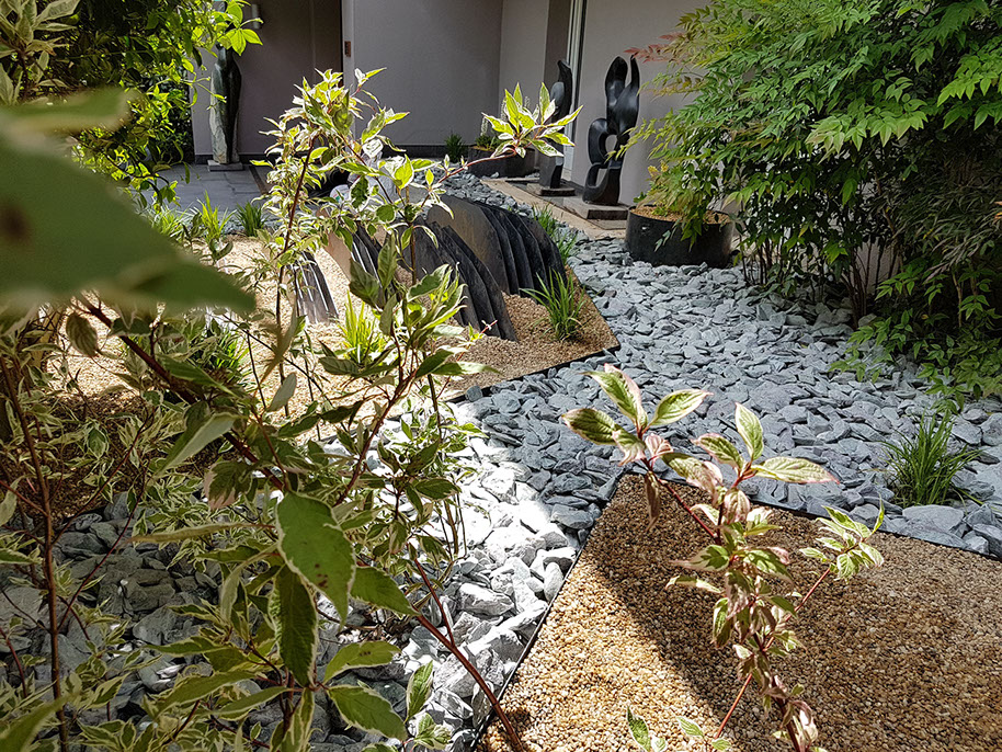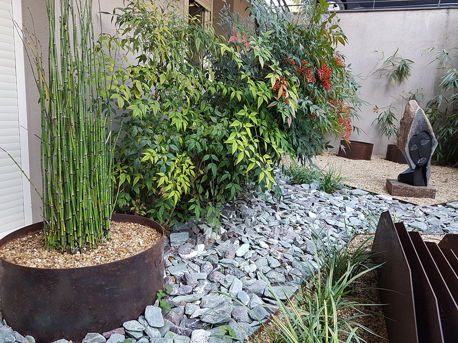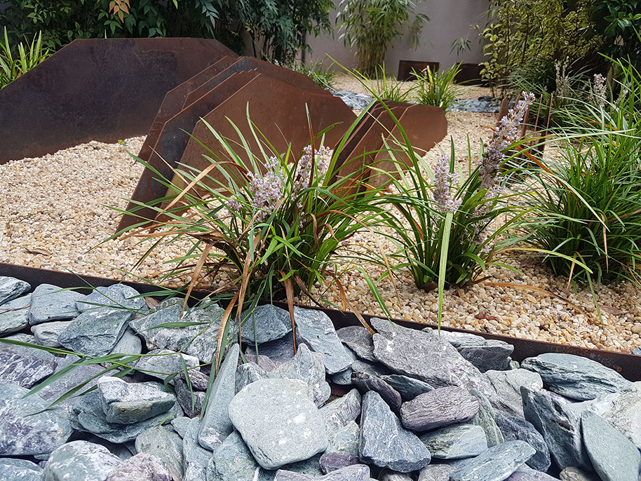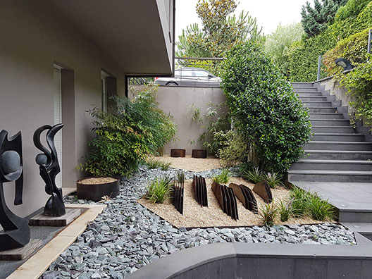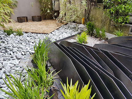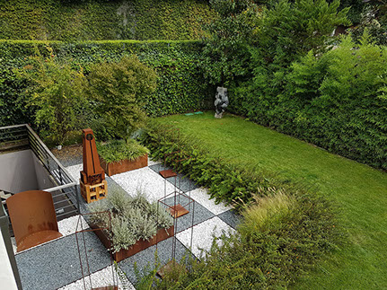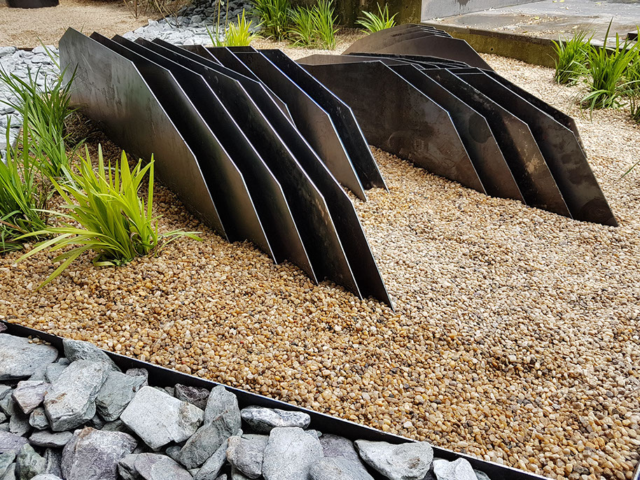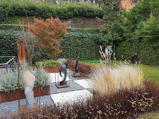 Sculpture garden. Designed together with Land Design Factory. Cor-Ten Steel Planters and sculptures by Planter Design Factory.