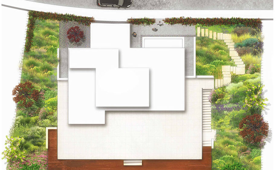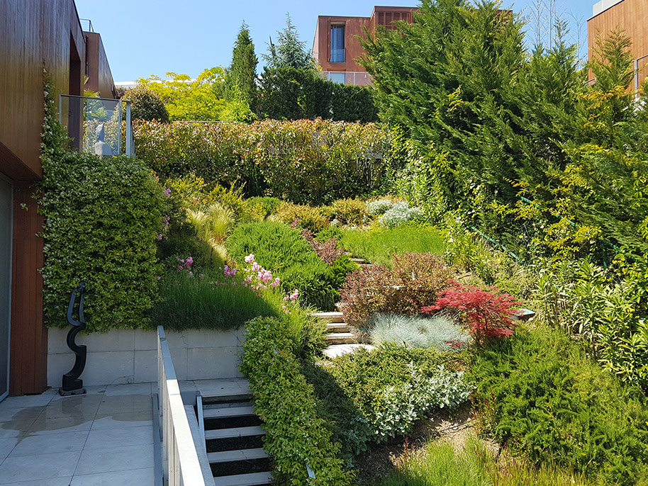 Located in one of the luxurious residence componds of Istanbul Cubuklu Vadi Konakları, residence lay upon a very steep topography. The main idea was to create low maintenance, water efficient garden for the inhabitants minimizing all the problems of topography. Designed together with Land Design Factory.